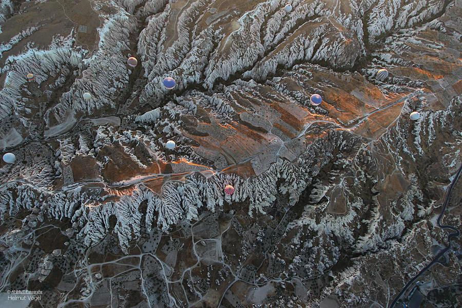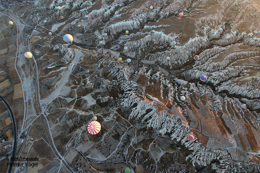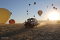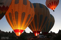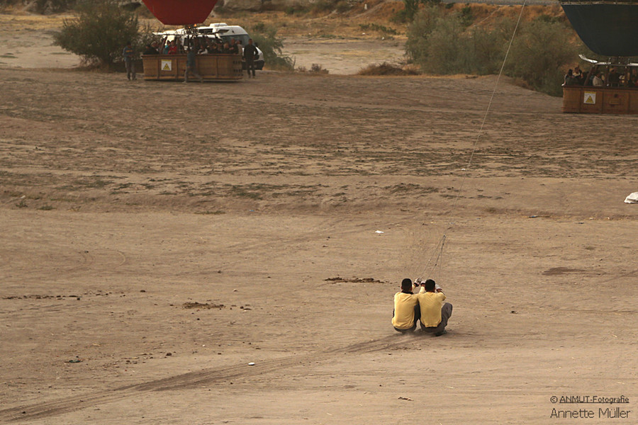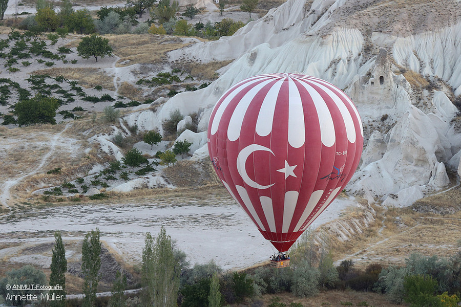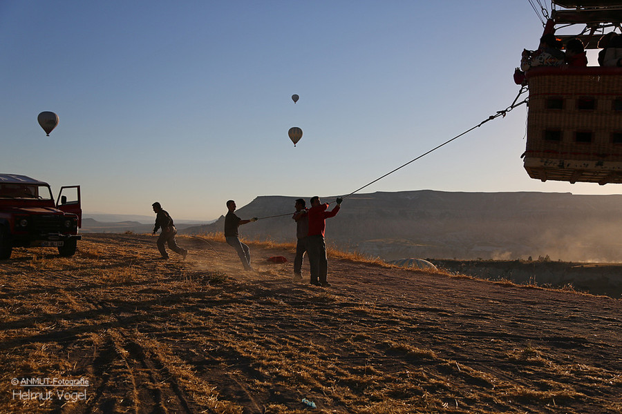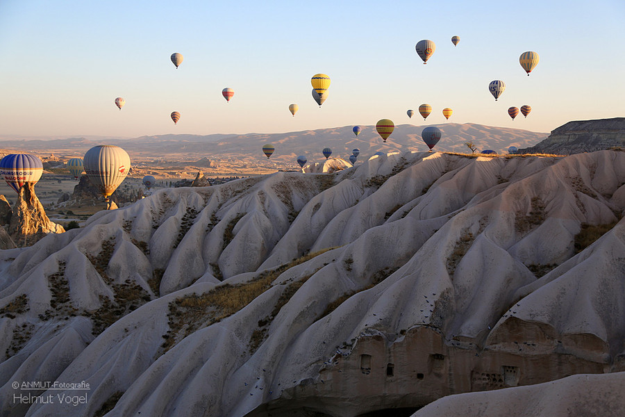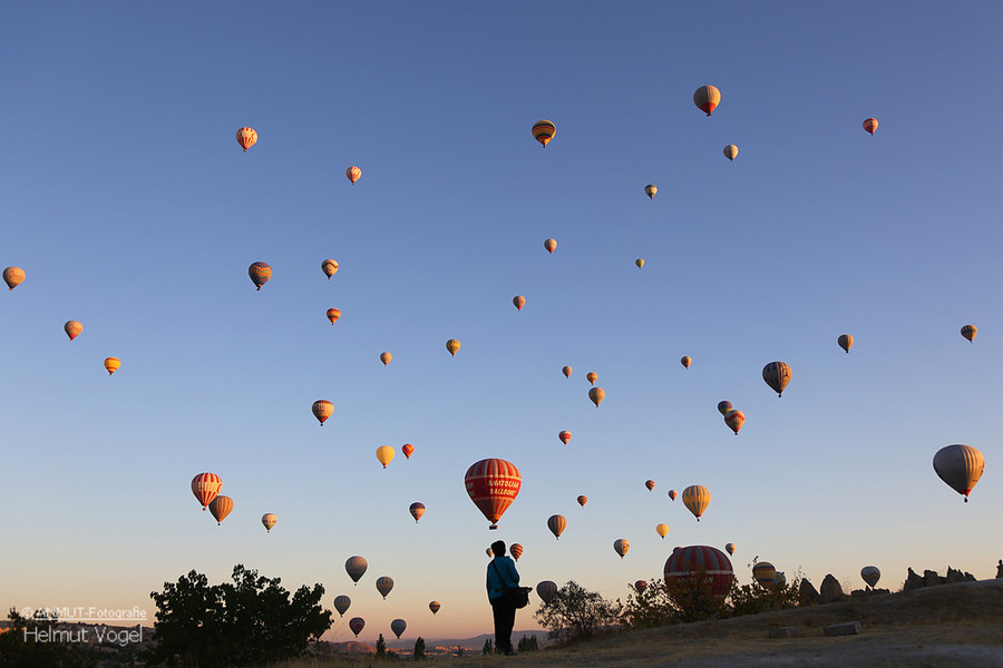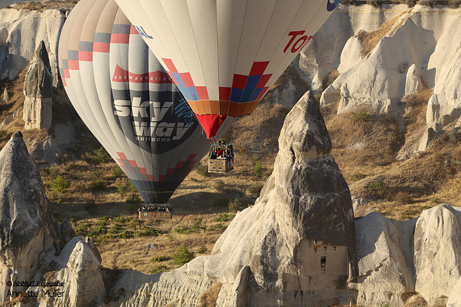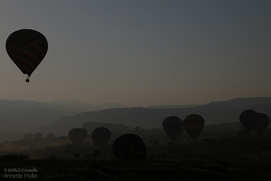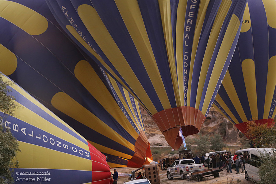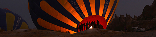 Es ist immer wieder ein geniales Ereignis, wenn morgens - bereits vor Sonnenaufgang - bis zu 150 Ballons gleichzeitig über die bizarre Landschaft schweben. Die von der heißen Gasflamme erleuchtete Ballonhülle scheint vor dem dunklen Himmel zu glühen.